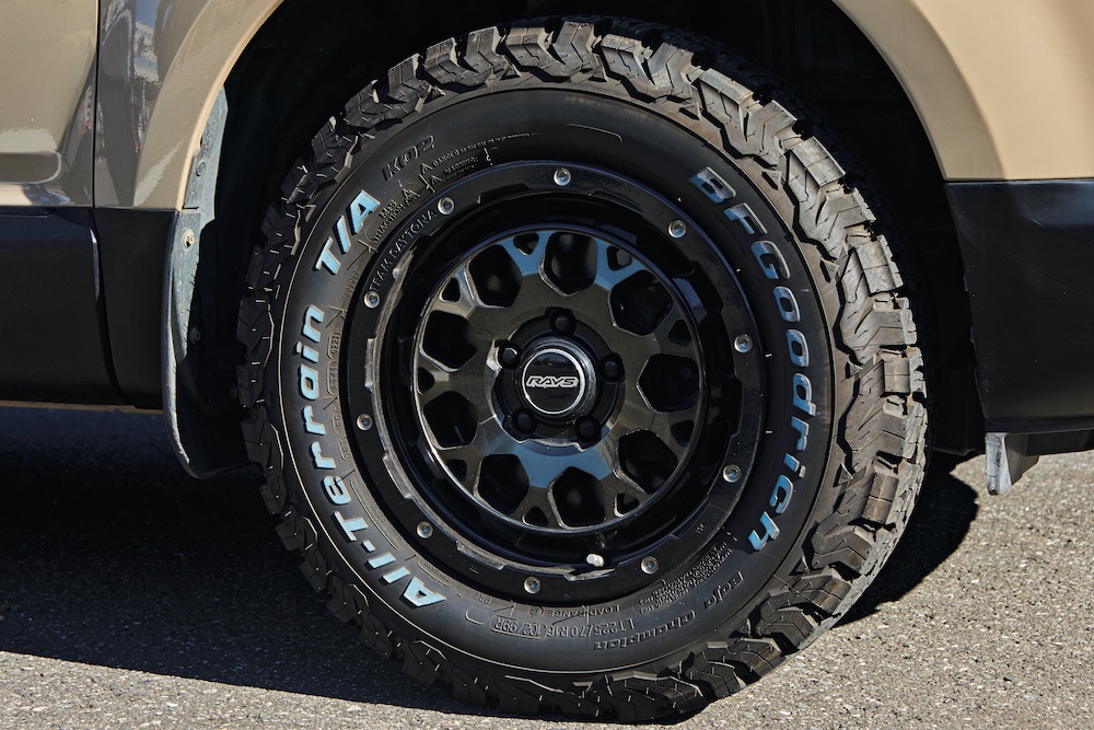 レイズのデイトナホイールに、BFグッドリッチのオールテレーンタイヤをセット。「キャンプ用にオールテレーンタイヤにして、車高も少しインチアップしました」。