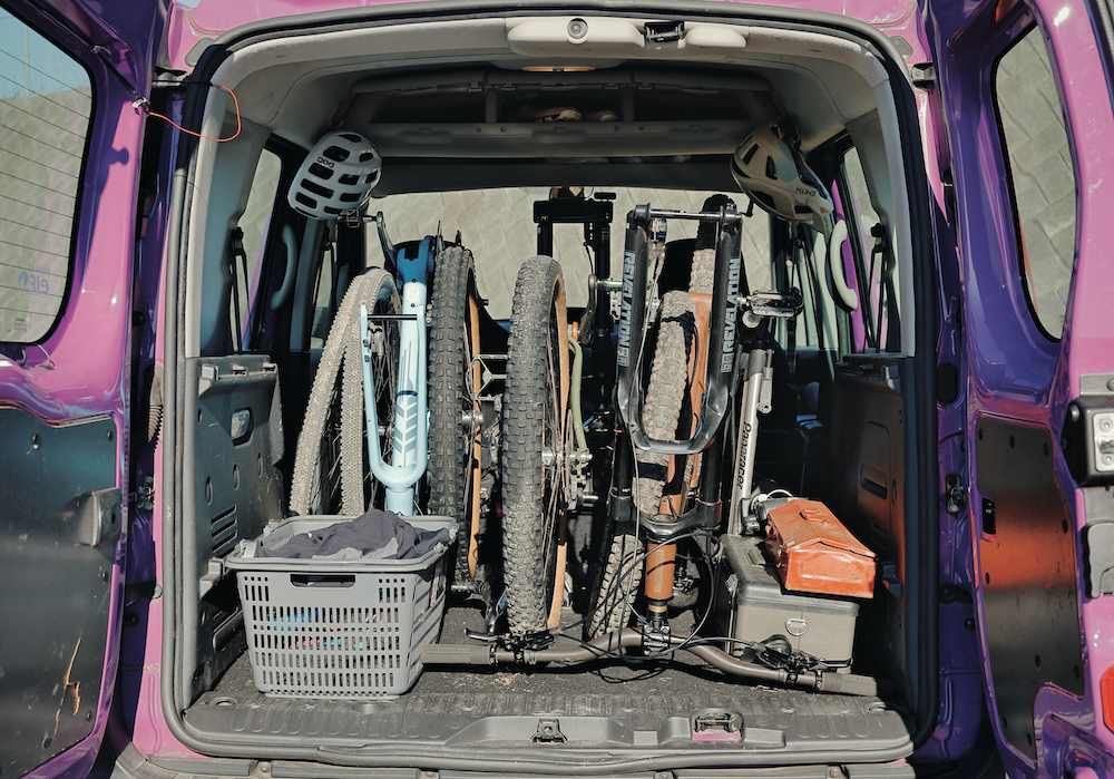 ラゲッジにはマウンテンバイクを2台、グラベルバイクを1台積載。さらにメンテナンス用のスタンドや工具も収納。「目指すは自転車専用の移動式ピットです」。