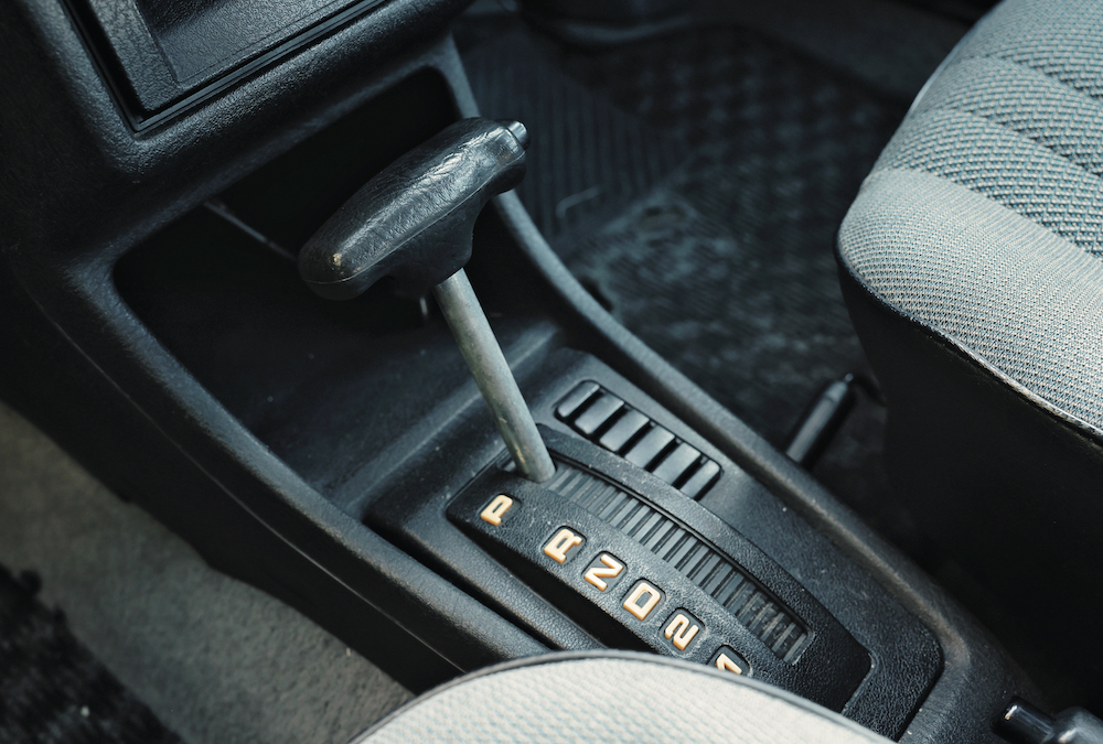 シフトノブも時代を感じさせるデザイン。「AT車だから通勤もラク」。
