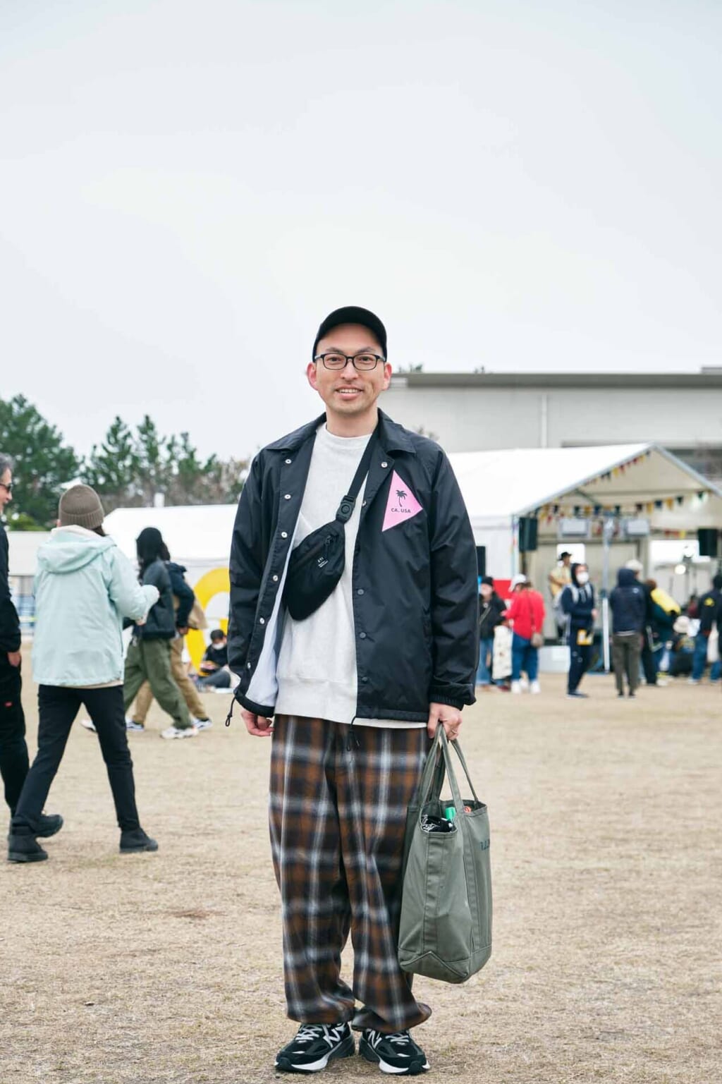 ゆったりのチェックパンツをはじめ、ストリート感のあるシルエットを絶妙なサイズ感で着こなす。ビーントートやEYLのバッグなどを組み合わせることで、アウトドア要素をプラス。