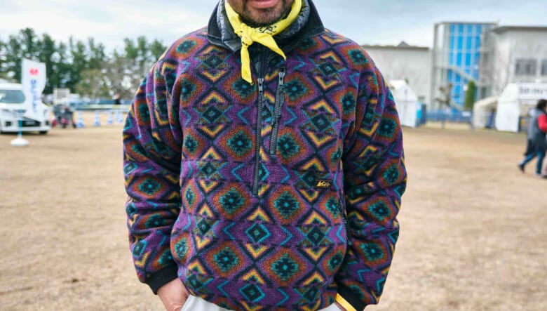 スタイリストの本間さん好きと公言するとおり、ツータックスをメインに据えたコーディネート。山と道のシンプルなシルエットのパンツに、アメリカンな総柄フリースをセット。
