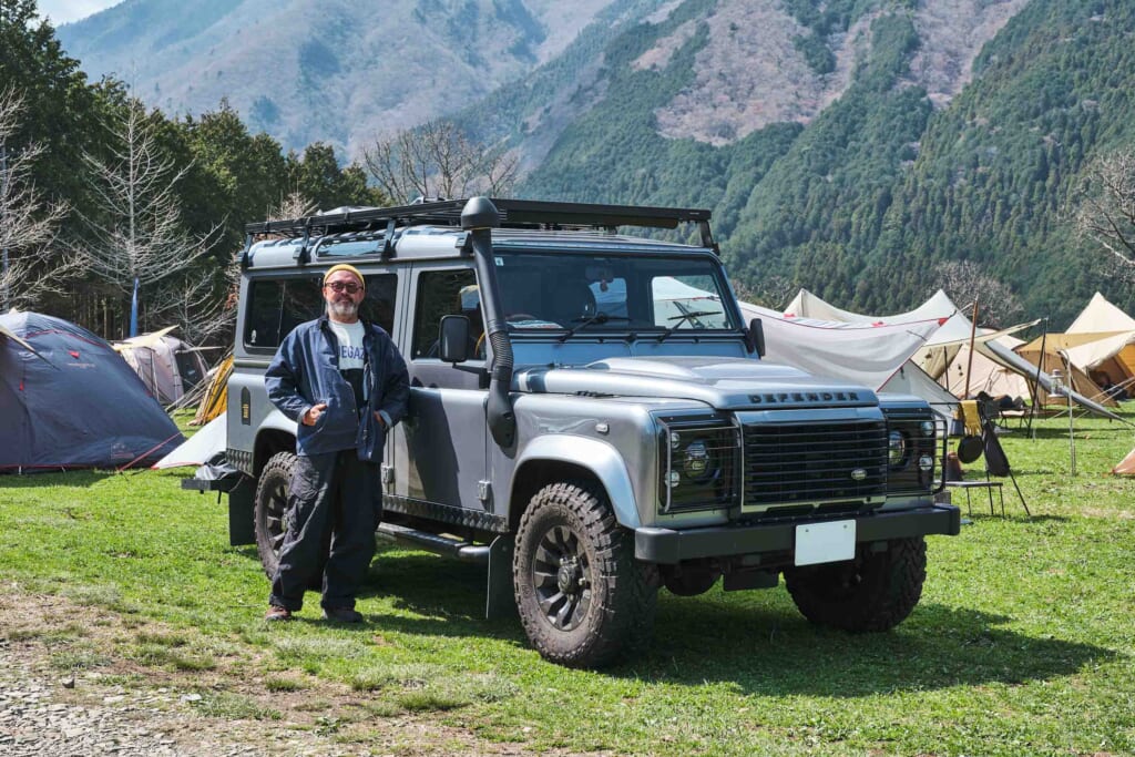 廃盤カラーとなった明るい印象のオークニーグレイのディフェンダーは6年前に購入。フロントフェイスやラック、ホイールなど時間をかけてカスタムを施した。「妻もキャンプ好きなので、硬めの乗り心地には目をつむってくれてます(笑)」。
