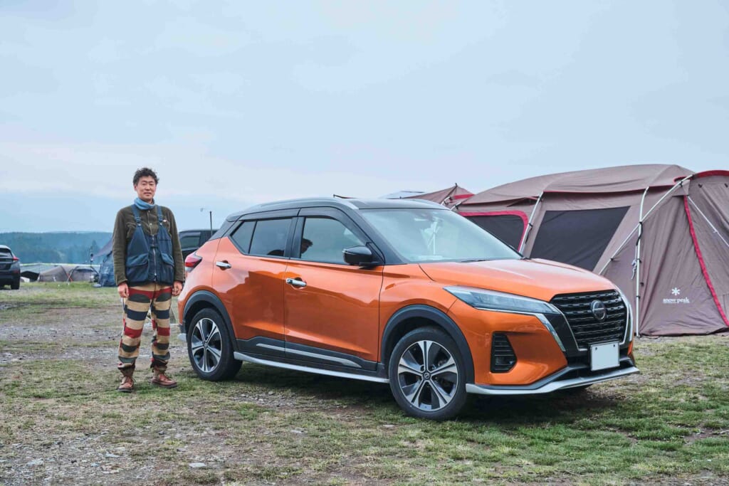 キャンプへ持ち込むアウトドアギアが増えたので、ジュークからキックスへ乗り換えた西村さん。スペースを最大限に活かすため、助手席に荷物を置いてリアシートに家族3人を乗せるスタイルを確立。「オレンジボディもお気に入りのポイント」。