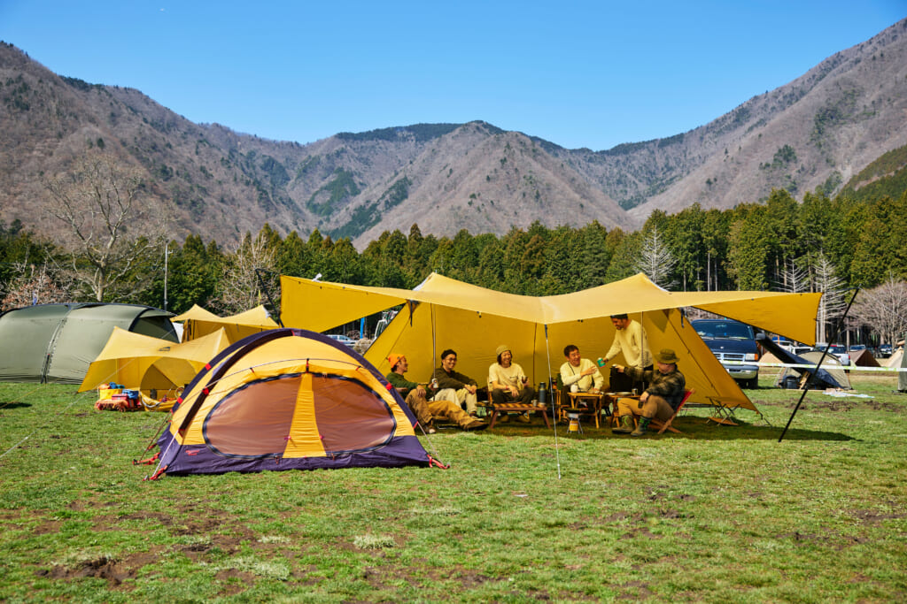 MSRやマーモット、ゴーライトなどアメリカ生まれの本格アウトドアブランドのアイテムを持ち寄ったこちらのグループ。異なるブランドのテントながらも、黄色で揃えることでサイト全体にまとまり感を出している。日中はシェルターのサイドウォールを跳ね上げ、大人数でも開放的に集まることができるリビングをつくっていた。もちろん使っているアイテムはそれぞれが持ち寄ったギア。それでもウッド素材メインのファニチャーが集まるだけでも、ゴチャついた雰囲気を払拭し、統一感のある空間をつくり出していた。