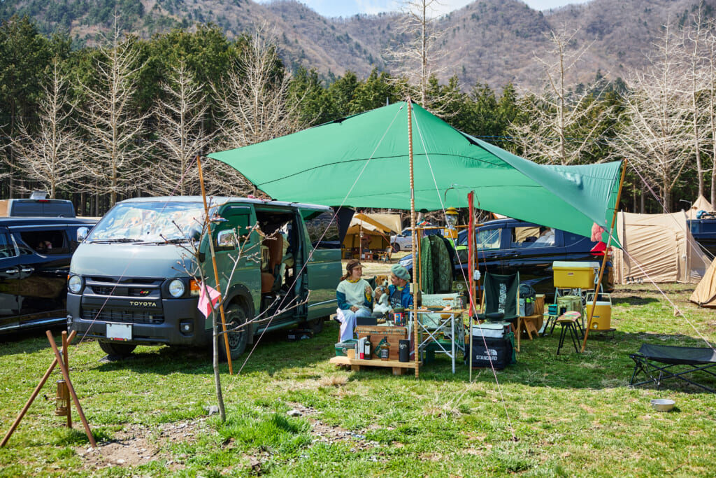 ハイエースで車中泊を楽しみつつ、カーサイドタープ下にリビングを展開していた夫婦のサイト。ファッションブランドが手がけるアウトドアギアを中心にスタイリングし、2人の趣味がぎっしり詰まった空間に仕上がっていた。また随所にヴィンテージショップで購入したボックスやラックなどを使っただけでなく、’70年代のヴィンテージコールマンのギアを混ぜ込むなど、まるで古着感覚でレイアウトの配置を楽しんでいる様子も印象的。年代やデザインに捉われることなく、好きなモノに囲まれた空間はなんとも楽しげだ。