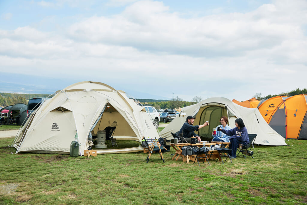 白のドーム型テント2張りをメインにサイトをつくり込んだ3人グループのサイト。リビングにしていたロボテックは、直径5.5mもある大型ドームながら、軽量なつくりが人気のテント。入り口が4ヶ所あり、夜はストーブをインストールし、暖かい空間を確保しつつも、天気のいい日中は窓を開けて開放的に使えるのが嬉しい。そんなテントを中心に、ウッディーな家具を取り入れることで柔らかい雰囲気でまとめつつも、小物にはグレーのアイテムを選び、かわいすぎない仕上がりにしているのも、秀逸なレイアウトだ。