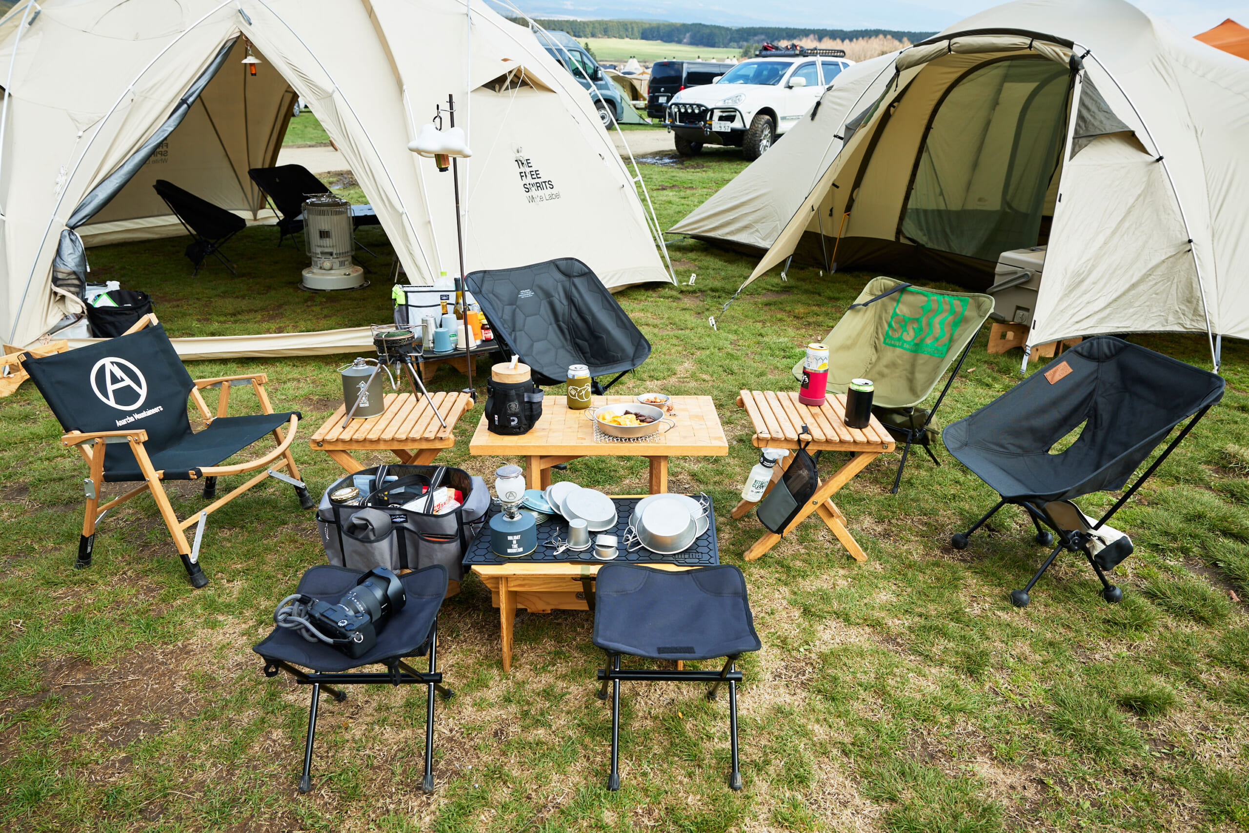 緑に映える白のテントをメインに、ウッド合わせのナチュラルテイスト。(GO OUT JAMBOREE 2025)