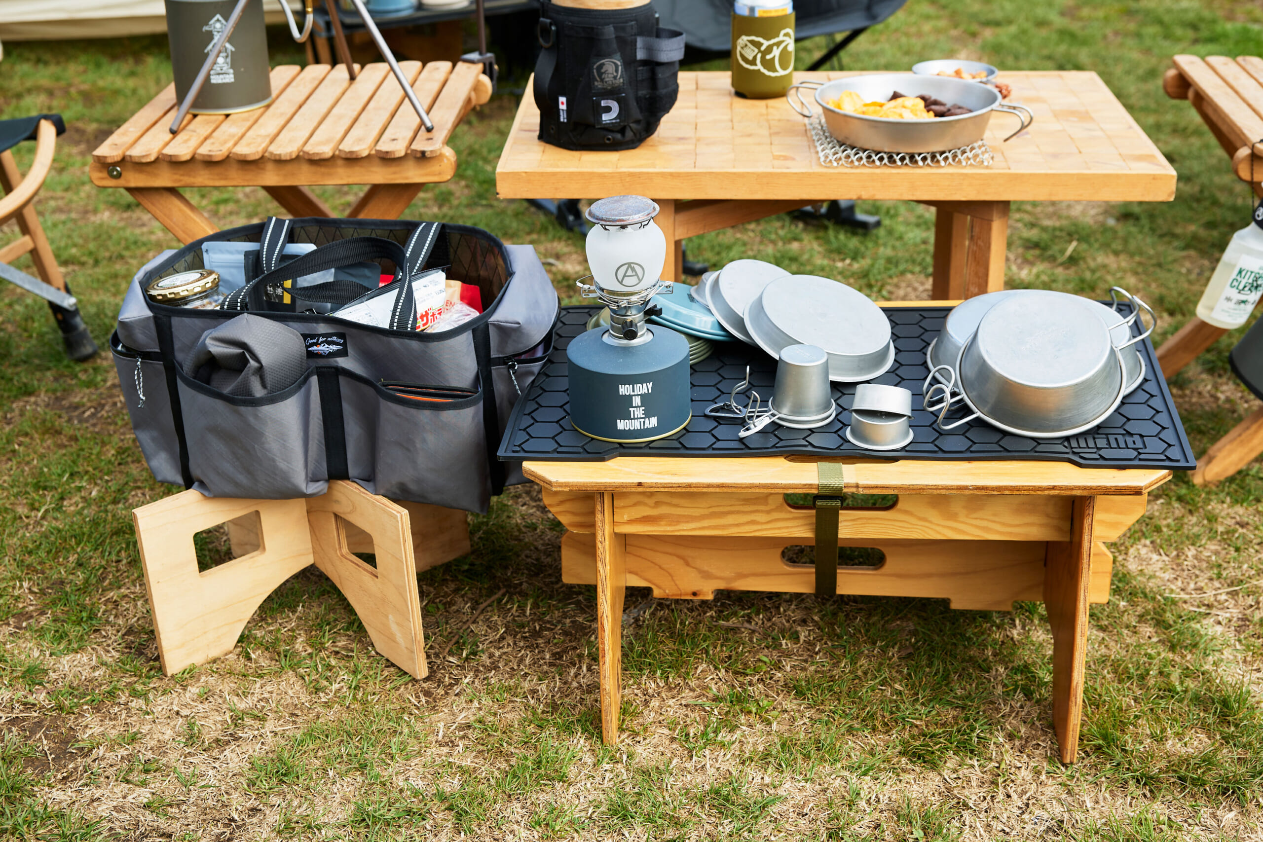 緑に映える白のテントをメインに、ウッド合わせのナチュラルテイスト。(GO OUT JAMBOREE 2025) Shiyori Kawamura作成日2025.05.03更新日2025.05.03 テーブルの手前に置いたペレグリンデザインファクトリーのスケーターテーブルには、ラバーマットを敷きバーカウンター的に活用。さらにグルキャン時などは洗い終わった食器を並べて置くのに便利だそう。 記事に戻る Shiyori Kawamura作成日2025.05.03更新日2025.05.03