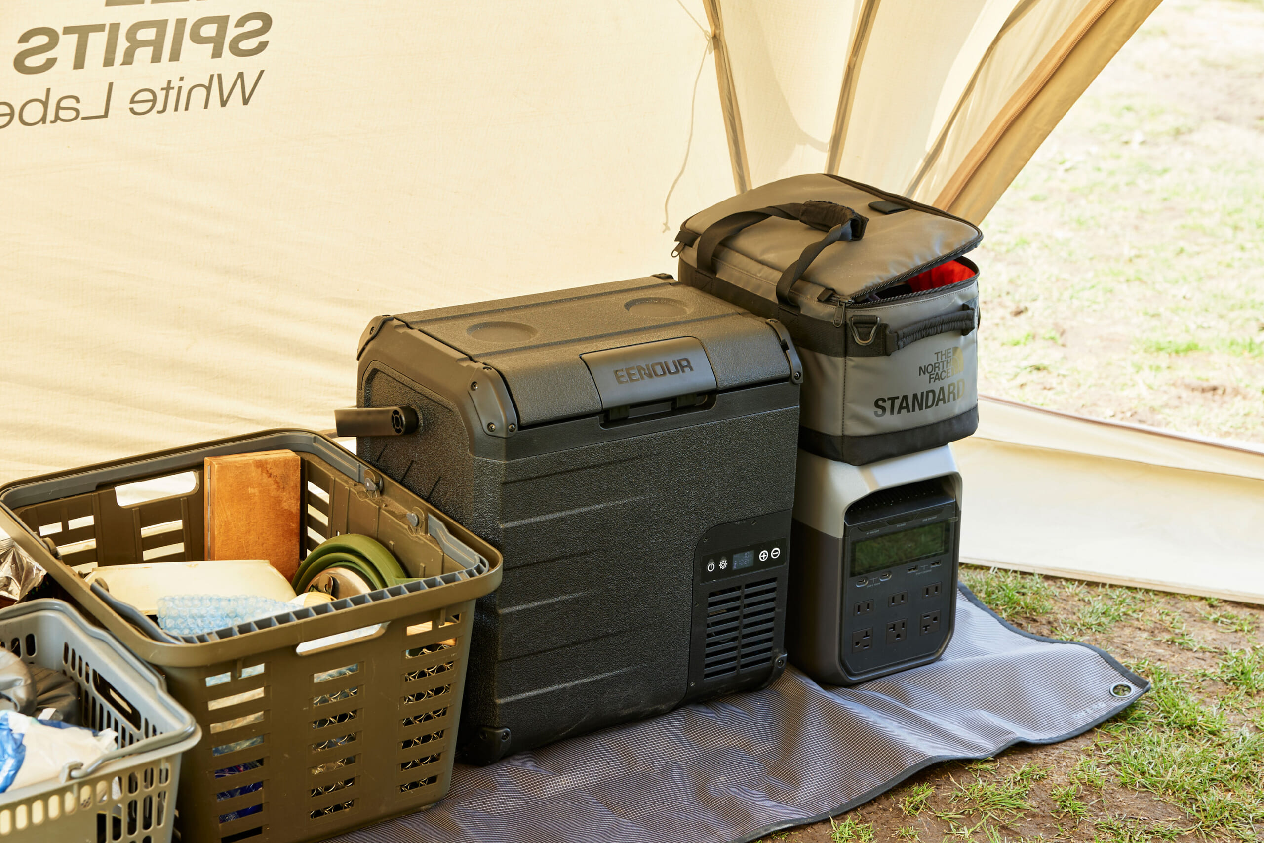 室内には、今回が初おろしというイーノウの冷蔵庫が。エコフローのポータブル電源もあり、連泊でも対応できるように。中にはビールなどをセット。