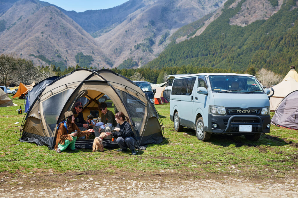 2組のカップル同士でイベントに参加していたこちらのグループは、ドームテントを4人の拠点に設営。それぞれ車中泊とテント泊で寝室を確保しているため、リビングは夜の団らんスペースとしてつくっていた。そのため室内は最低限のアイテムだけで十分快適。イギリスから取り寄せたというドームテントはオトナ4人なら不自由なく過ごせる広さ。中にはゴロ寝もできるコットを2台置き、下は収納に活用し、手を伸ばせば必要なアイテムがすぐ取り出せるような動線にするなど、使い勝手のいいレイアウトもぜひ参考に。