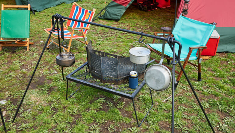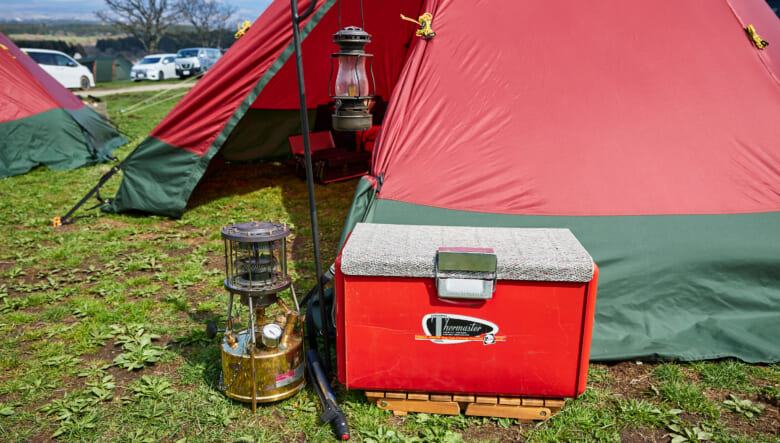 テンティピのワンポールテントをシンメトリーに配置し、寝室とリビングを兼ねた空間として使っていた4人グループのテントサイトだが、やはり目が行くのは焚き火を囲みつつ団らんするための空間。アイアン素材のアイテムを中心にそろえ、サンゾー工務店のロダンやマンゲツを2台体制でセッティング。ここで暖を取るだけでなく調理も楽しめるよう、アイアンラックもしっかりと設置。またテント室内を含め、随所に散りばめられたヴィンテージギアの雰囲気も相まって、アメリカのキャンプシーンを彷彿とさせる。