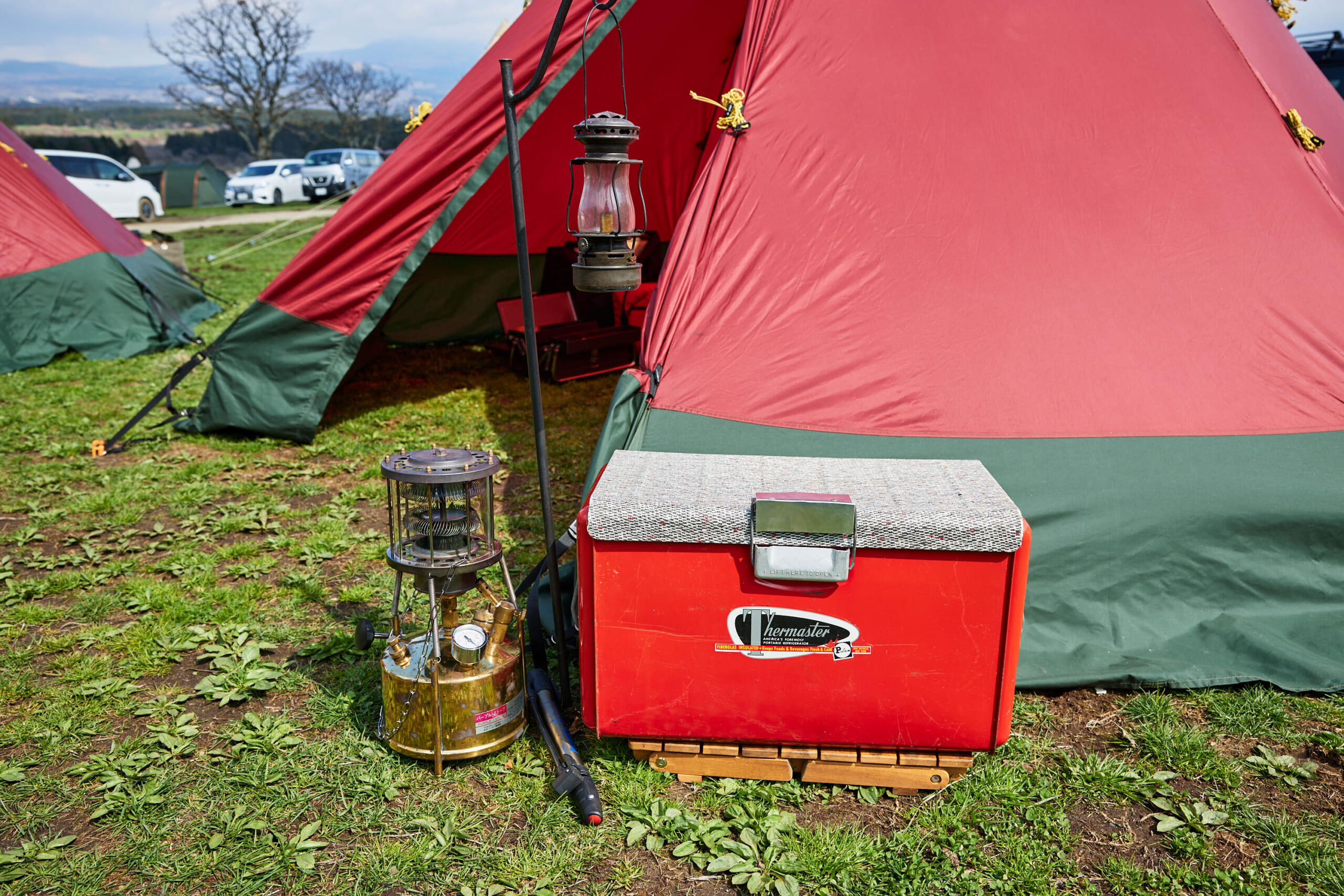 古きよきアメリカンな雰囲気の、仲間と焚き火を楽しむ空間。(GO OUT JAMBOREE 2025) Shiyori Kawamura作成日2025.05.03更新日2025.05.03 テント入り口にはそれぞれダイキチハンガーを使いレイルロードランタンやスケーターズランタンを吊り下げている。さらに防寒用の武井バーナーのパープルストーブと、’70年代のサーマスターのクーラーボックスが。 記事に戻る Shiyori Kawamura作成日2025.05.03更新日2025.05.03