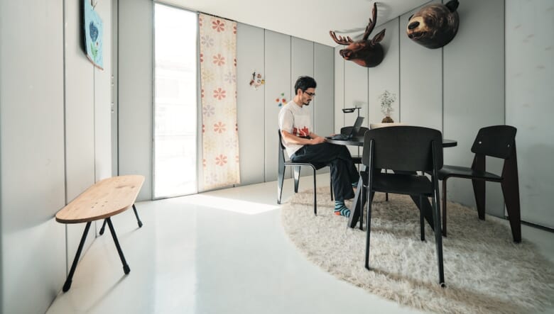 家族3人で暮らす縦長の長井邸は、広さよりも都心部に住む利便性を優先し、わずか5.1坪の面積に建てられている。愛車の’96年式ミニ・モークからも見てわかるように、快適さよりもデザインが美しいか、使っていて楽しいか、を重視したセレクトが印象的。