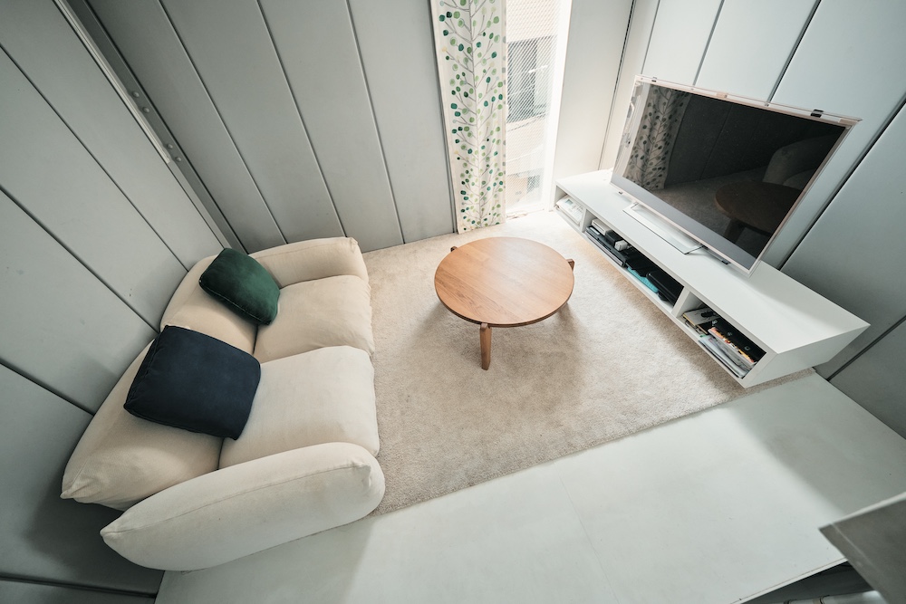 「3階」はリビング。40年以上愛用するソファはアルフレックスのマレンコ、ローテーブルはジャン・プルーヴェの作品。少し値の張るデザイナーズ家具でも妥協せずに選べば長く愛用できるそう。