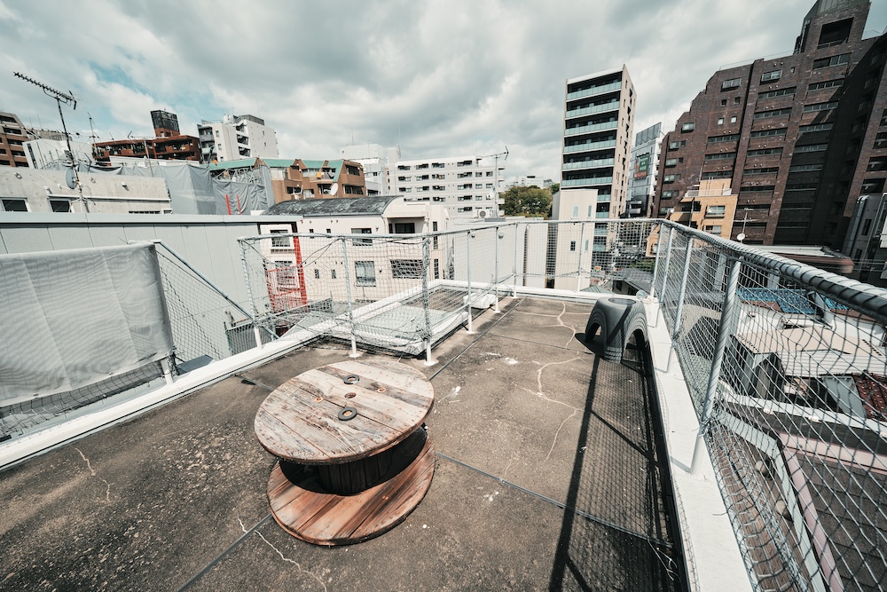 当初から希望していたという屋上。「都心部の家だからこそ、友人が集まりやすい場所にしたくて。 少し階段が急なので、オトナ用の贅沢な空間です」。濡れたテントを乾かす場所としても活躍。
