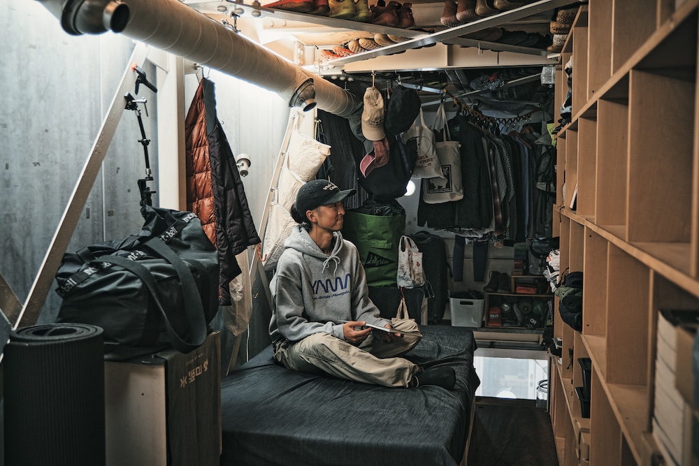 丸山さんが借りているのは、ロフト状にわかれたフロアの2階部分。細長い空間にはマットレスと収納ボックス、備え付けの壁面ラックが用意されているのみで、洋服やシューズ、そして趣味のサーフィンや登山用のギアは工夫して階段上の空間を活用した。天井裏の梁には20足分のシューズを並べ、S字フックやカラビナ、万力などを活用しバックパックやウェットスーツなどを吊り下げている。また海外時代から愛用するデイジーチェーンはクローゼット変わりに活用。またシュラフを日常の掛け布団として使うなど、手持ちのアイテムを普段使いすることで、多趣味ながらもミニマルな生活を送っている。