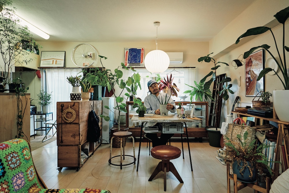 萱沼伸義(インテリアスタイリスト) GO OUT編集部作成日2025.05.26更新日2025.05.26 こちらのヴィンテージ物件は、2LDKだった間取りをリノベして1LDKにしているため、広めのリビングダイニングとベッドルームで構成されている。リビングダイニングは左手にコンパクトなキッチンを併設したL字型のフロアで、木箱を積み上げたカウンターによって、キッチンとダイニングを半セパレート化している。1人暮らしなのでコンパクトなソファも置かれているが、メインで過ごすのはダイニングテーブル。大型植物に囲まれた席が萱沼さんの定位置。 記事に戻る GO OUT編集部作成日2025.05.26更新日2025.05.26