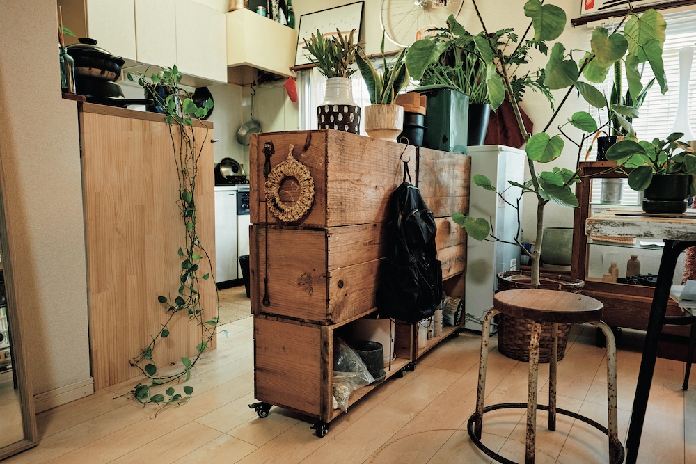 メイン写真の左手に位置するキッチンとダイニングを仕切る棚は、撮影で使用したリンゴ箱。「積み上げて冷蔵庫と繋げました」。