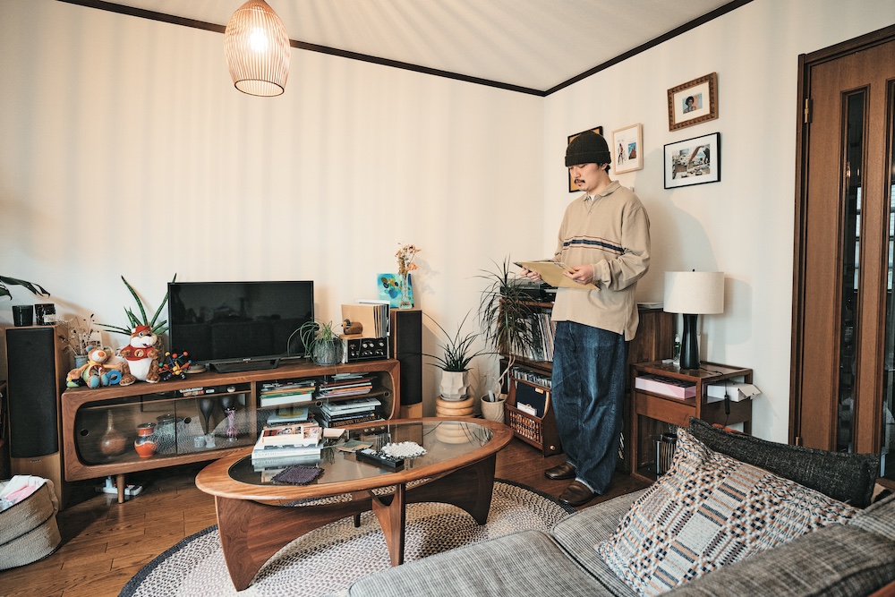 増田さん、奥さんと生まれたばかりのお子さんとの家族3人暮らし。2階が玄関のアパートで、1階には駐車場、2階にリビング、3階に作業場と寝室がある。右手には玄関に続く廊下と階段が、左手には中庭。手前に置かれたソファの裏にはダイニングテーブルとキャビネットを配置。日本的でアノニマスな内装は、「床板の深い色味が好き。天井が高すぎないのもいいし、天井の廻り縁もなんとなく可愛いくて気に入っている」とか。ミッドセンチュリー期の家具もマッチ。