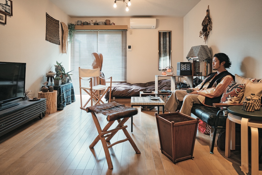 芹沢良輔(ビームス プレス) GO OUT編集部作成日2025.05.26更新日2025.05.26 練馬区のアパートのワンルームで1人暮らししている芹沢さん。左手にテレビや観葉植物を置き、左手後方に洋服ラックとその先に玄関。右手奥にはベッド、右手後方にはキッチンがあり、その前に積み重なったリモワのスーツケースとシェルフ、ソファが並ぶ。家具はなるたけ背の低いものを選び圧迫感を無くす。さらに、「小さく見えるモノほど遠い」と錯覚する視覚効果を狙い、部屋の奥に向かうにつれ家具の背が低くなるよう配置しているのもワザありポイント。 記事に戻る GO OUT編集部作成日2025.05.26更新日2025.05.26