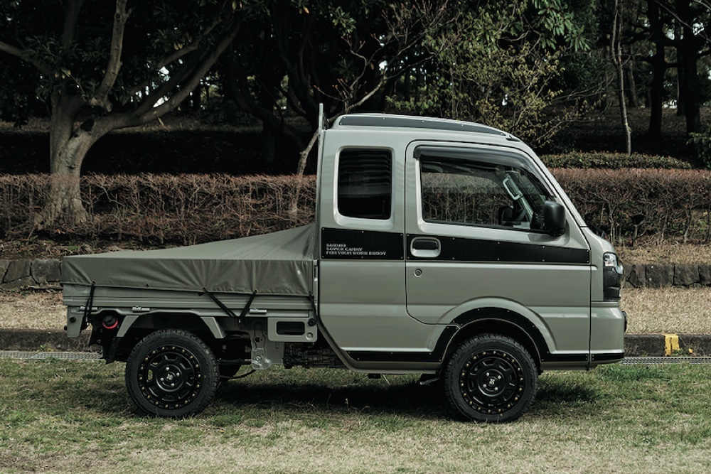 グラフィックも含め外装はすべてXリミテッドの純正。足回りはリフトアップとインチアップホイールでカスタム済み。車体同色のカーキカラーの幌は、防水性に優れた軽量帆布で作られたスーパーキャリイ専用モデル。