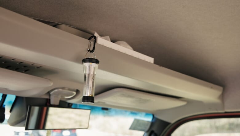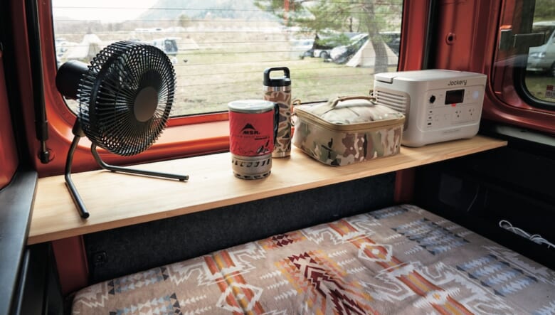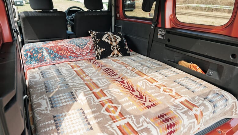ホンダのフィットやバモスなど、国産の軽自動車を乗り継いできたキャンさん。「登山やスノーボードで山に行くことが多いから、狭い林道を走れて、車中泊できるクルマがいいんですよ」。そのため車中泊仕様のカスタムも欠かせない。
