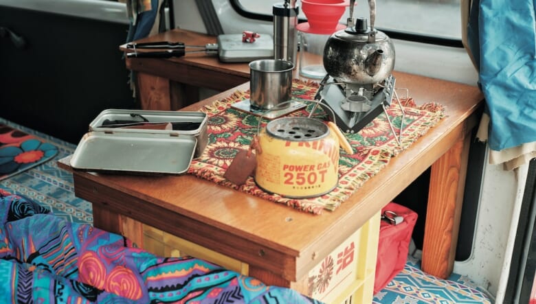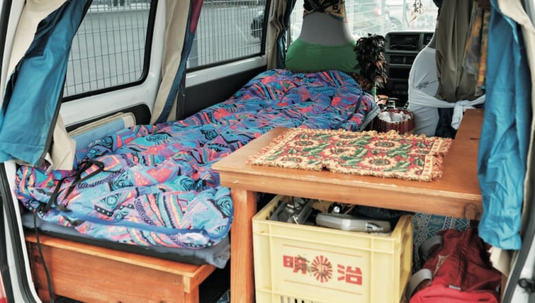車内はDIYで車中泊カスタムが施されている。「車中泊をしたかったのも、乗り換え理由のひとつ。なるべくジブンで内外装をいじりたかったから、これ位のサイズがちょうどいいんです」。
