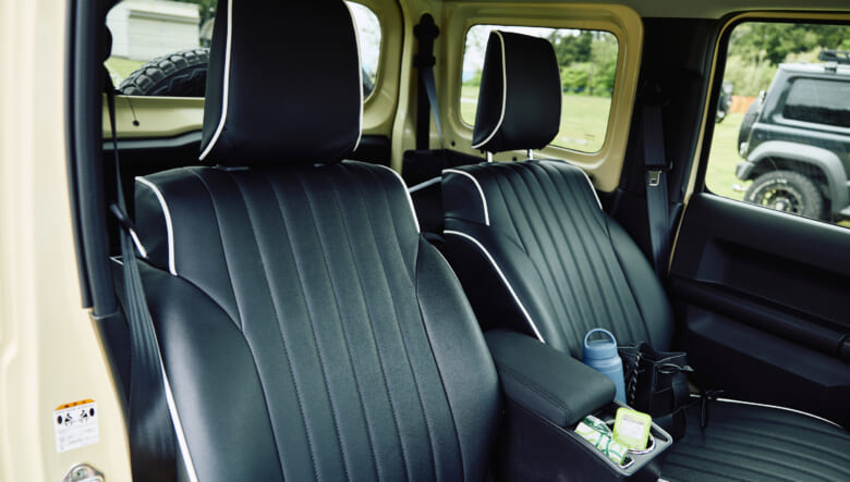 すでにカスタムされている未使用状態の1台を新古車で購入したCちゃんさん。ボディはルーフ塗装されたモデルだったそうで、フロントまわりはKLCのヘリテージグリルとバンパーに。購入後にネットで購入したシートカバーを装着している。