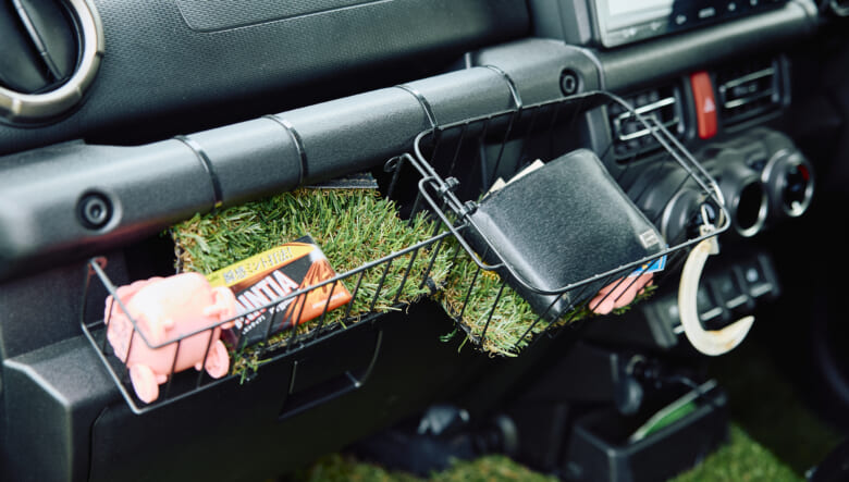 購入してすぐに長年の憧れだったというルーフトップテントをセッティングしたジムジローさん。選んだのは2人が寝られる広さがあるGIワークス。まだ車内は収納用のカゴをアシストグリップに付ける程度で、今後のカスタムを計画中だそう。