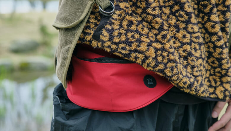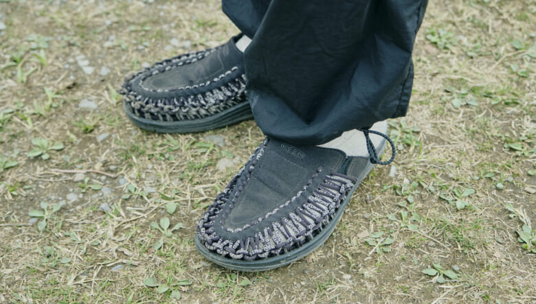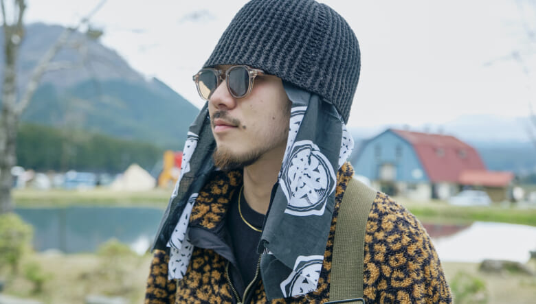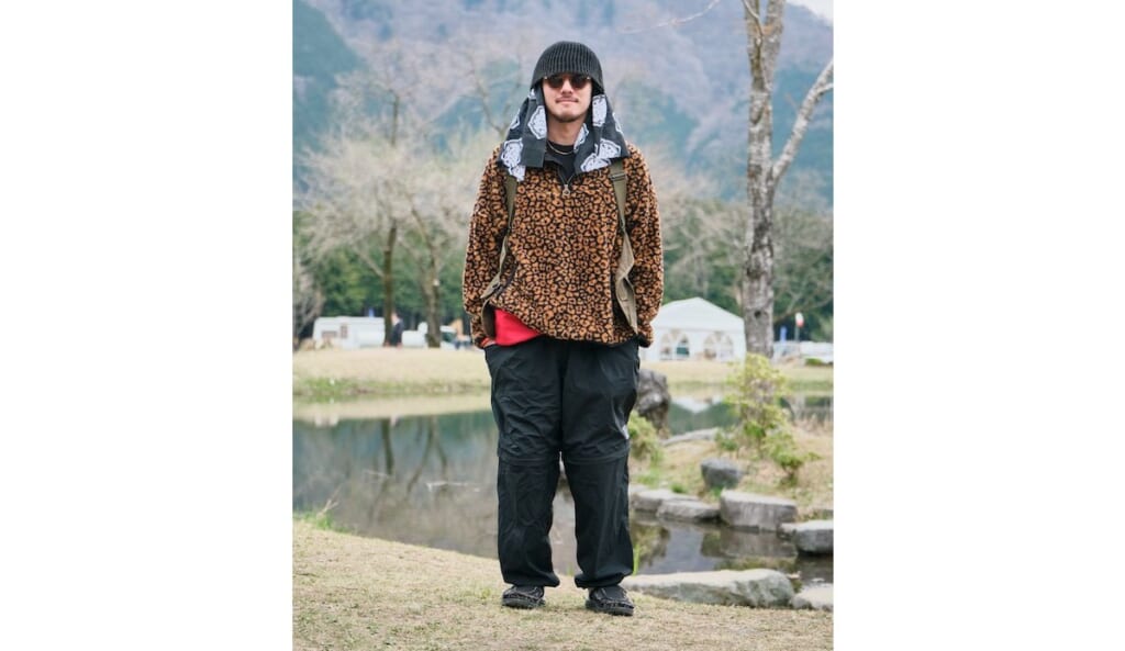 ブラックをベースにしつつも、レオパードや柄モノの手ぬぐいで無骨なアウトドアスタイルを演出。足元はサンダルで重たくなり過ぎないようにバランスをとった。