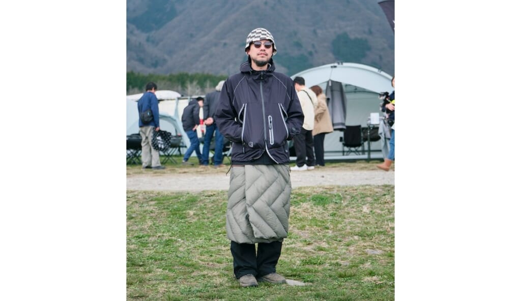 アウトドアブランドのアイテムをモノトーンでまとめ、都会的な装いに昇華。ブランケットは肩がけではなく、スカート風に使いこなすテクは参考にしたいところ。