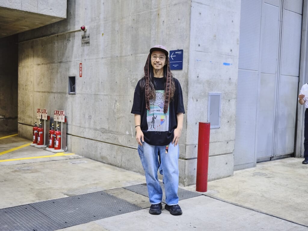 オーバーサイジングなグラフィックTをメインに、デニム、スニーカーというシンプルなコーデでも個性を放つスタイルへと昇華。長く垂れる耳当て付きキャップも、キャラにハマっていてグッドだ。