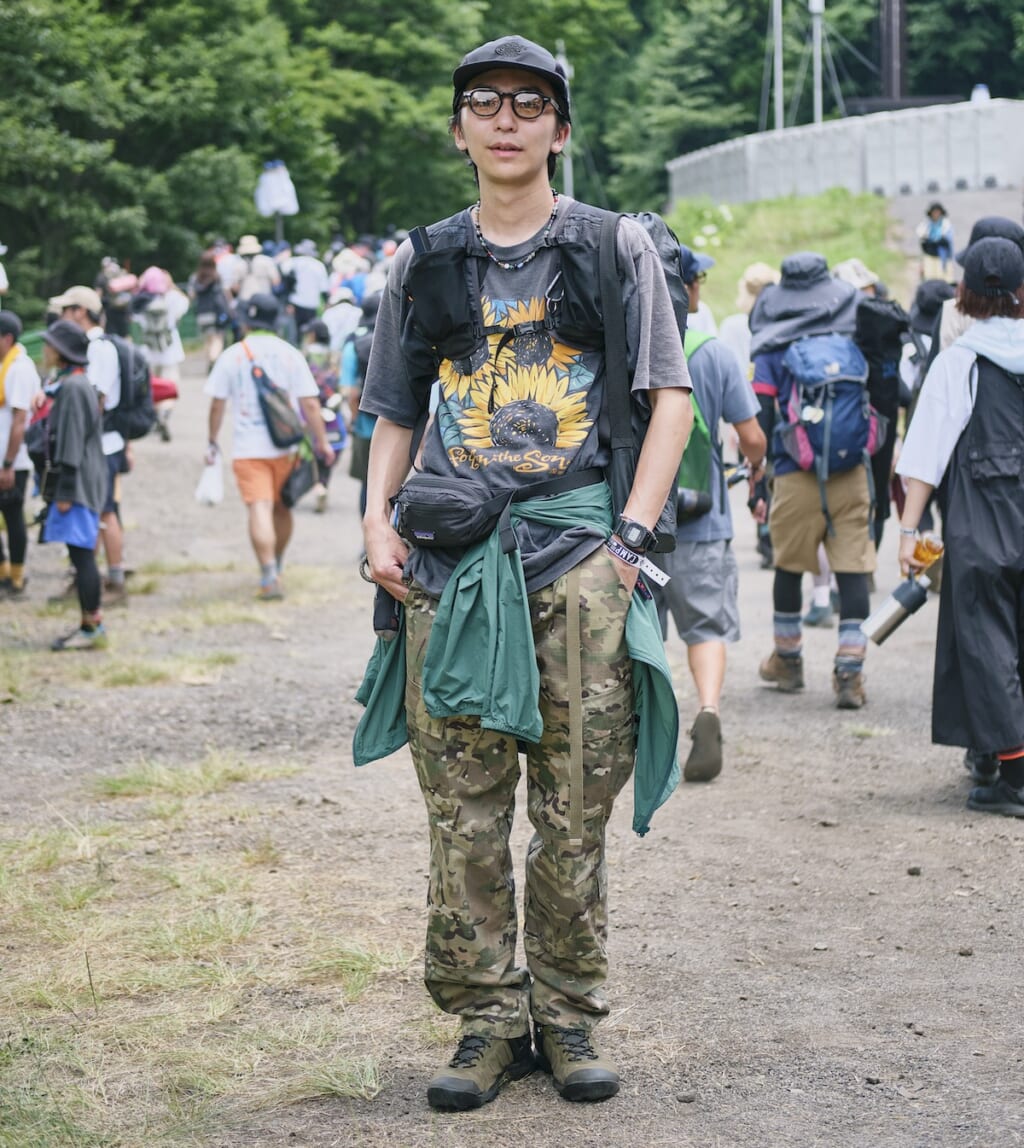 上半身はブラック系で合わせ、下半身はミリタリーカラーでまとめた無骨な着こなし。そこに絵画のような向日葵がプリントされたTシャツを選ぶことで、ゴツさを調和し、夏フェスらしさもアピールした。