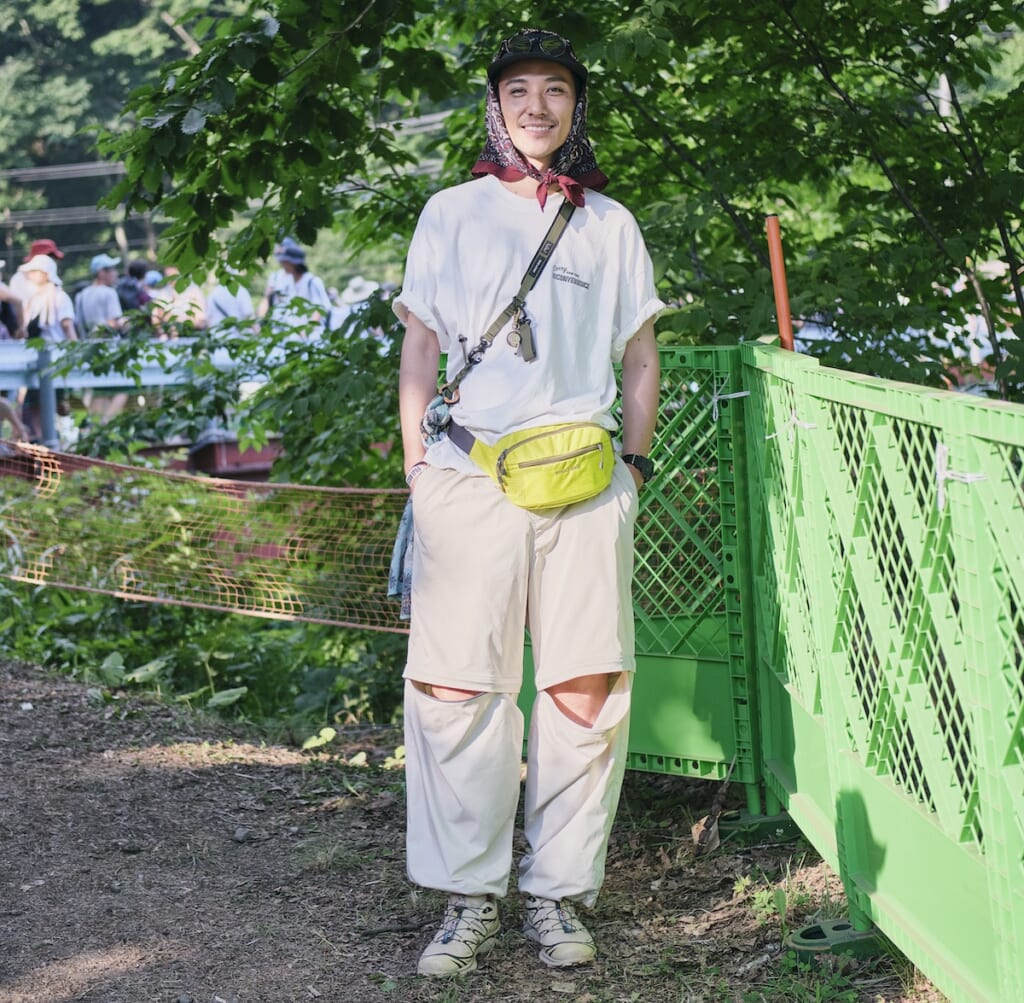 雨で泥だらけになることもありえるフジロックとあって、敬遠するヒトが多いかもしれないが、あえての白でまとめたコーディネート。その潔さが個性を放ち、手ぬぐいなどの小物使いでフェス感もアピールした。