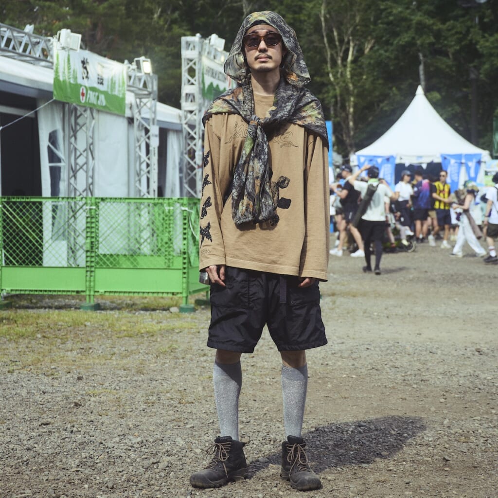 ツリーカモのメッシュストールで日射しをガードし、キーンのブーツには気分を上げるシルバーのラメ入りハイソックスを。全体的にアウトドア感あるアースカラーでまとめたメリハリの効いたスタイルに。