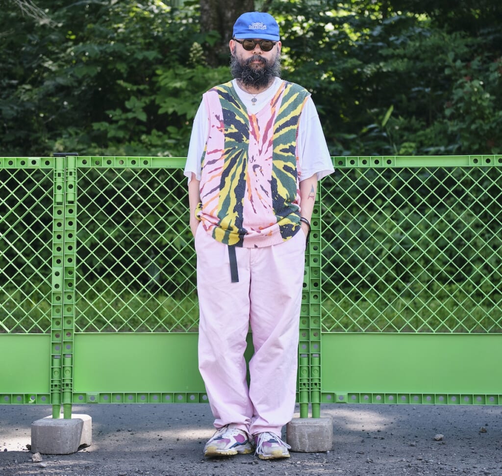 街でスナップしたかのようなリラックススタイルを披露してくれた五十嵐さん。ピンクベースの色合わせやタイダイの柄使いなども個性的で、フェスだからと力みすぎない、あえての脱力感がおしゃれを演出。