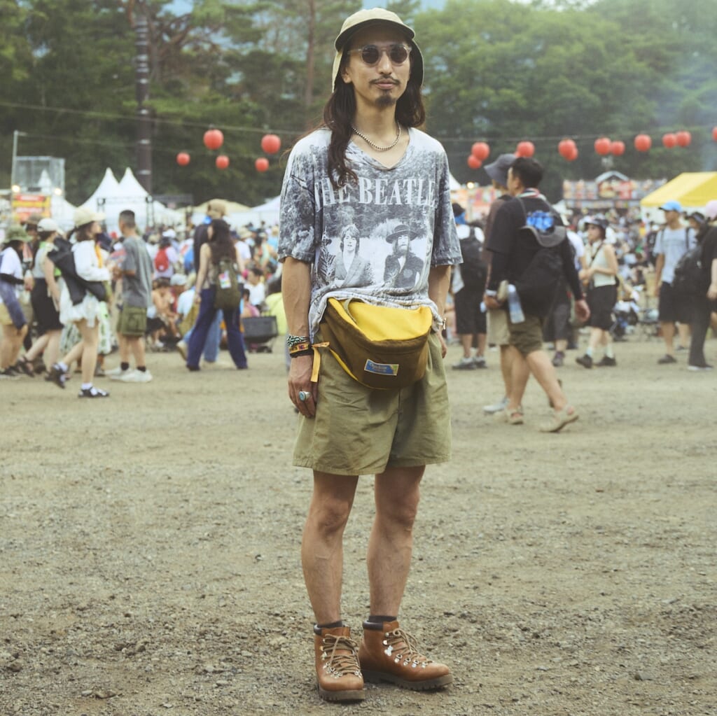 ビートルズのTシャツに大きめのウエストポーチなど、夏フェス感全開な古着系アメカジスタ イル。足元には急な雨でも安心感抜群のパラブーツを。ナバホ族のインディアンジュエ リーでジブンらしさも表現。