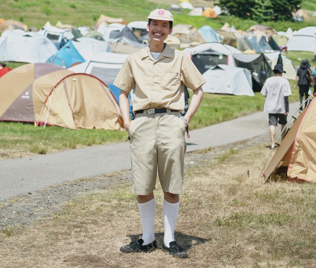 さながらアメリカの少年のような着こなしは、ウェス・アン ダーソン監督の『ムーンライズ・キングダム』をイメージしたそう。ボーイスカウトらしいアースカラーの合わせもキャンプエリアの雰囲気にマッチ。