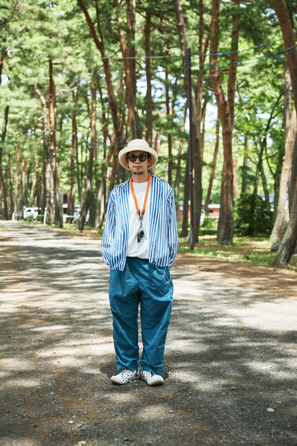 暑さを和らげてくれそうなブルーをメインにコーディネートしたタケイさん。ナイロンメッシュの素材シャツは、蚊帳として使われているものを羽織りに。長袖でも涼しく、防虫効果はキャンプにもってこいだ。