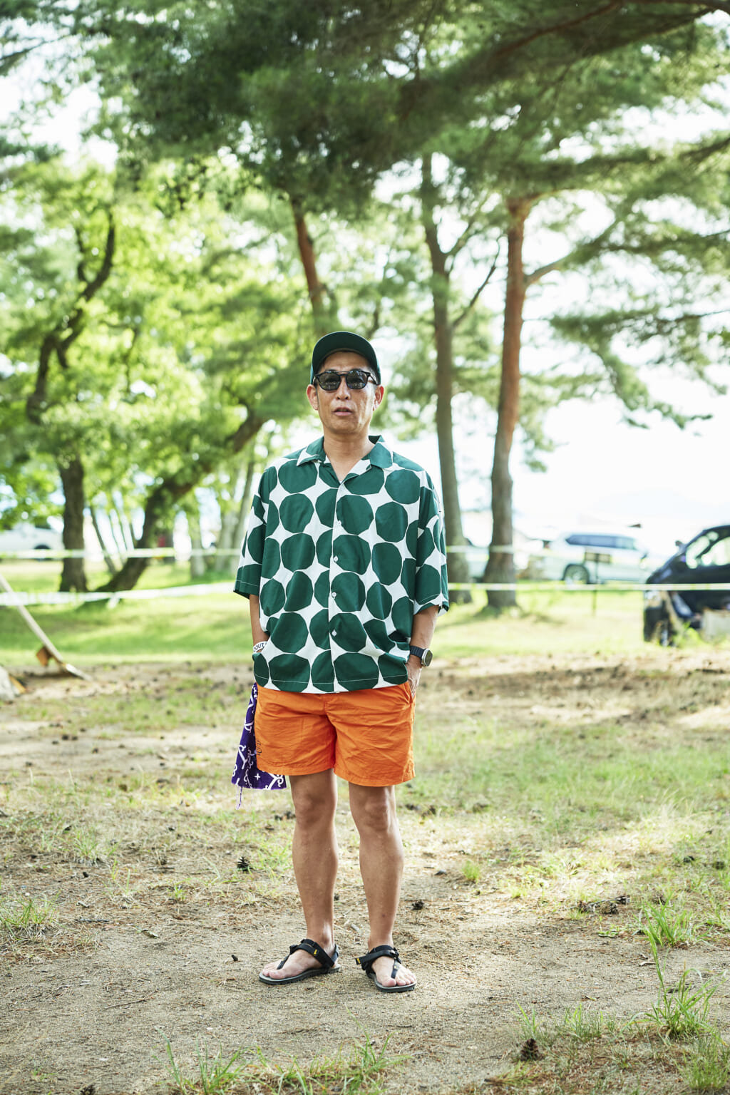 存在感バツグンなグリーン×ホワイトのシャツに、ショーツのヴィヴィッドなオレンジが、フェスらしさを感じる配色。開衿シャツは古着屋で購入したもので、レトロな総柄プリントによるオトナの夏スタイル。