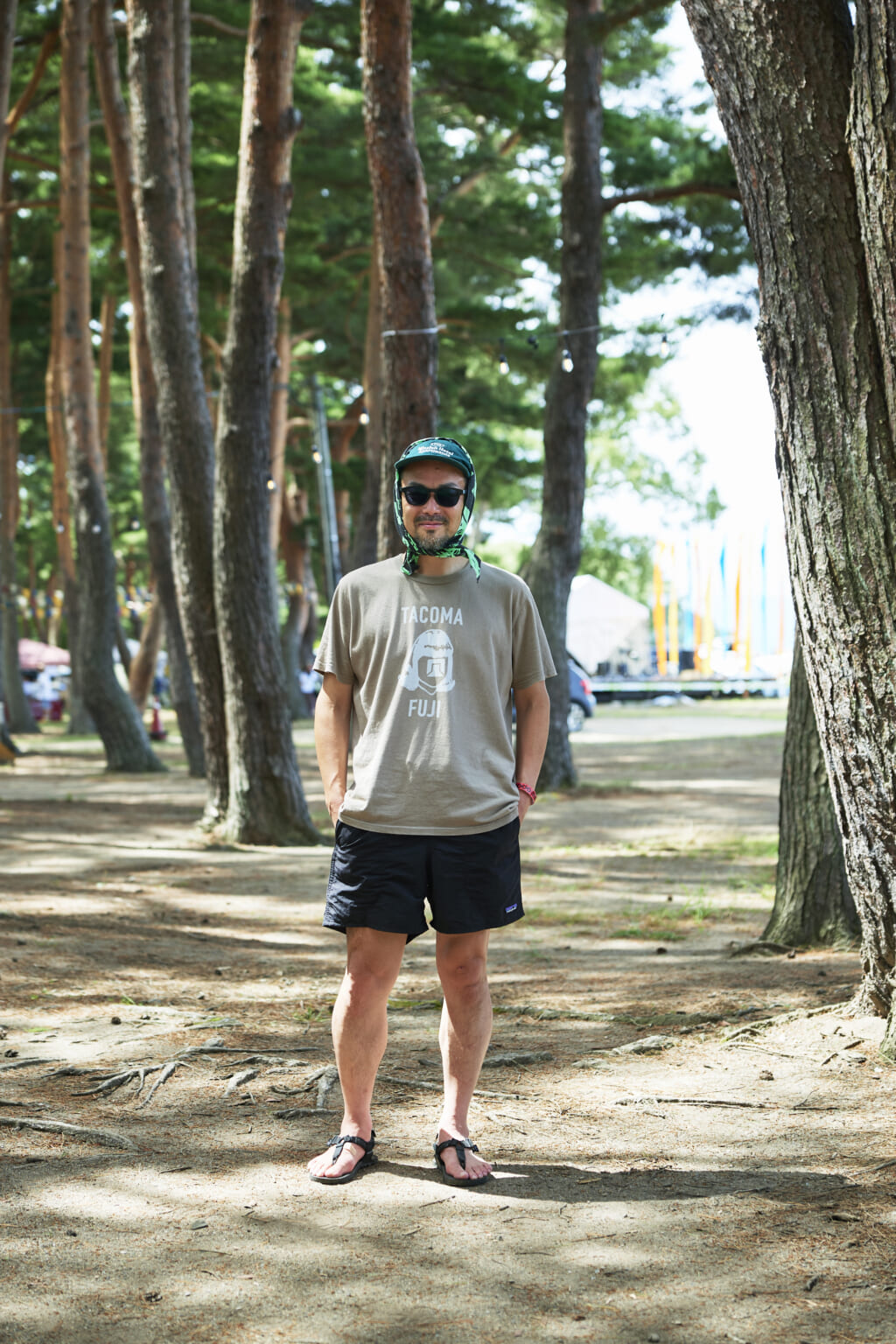 Tシャツ&ショーツで王道の夏スタイルは、アースカラーをメインに。キャップと色を合わせた手拭いは、会場となった福島県の酒造によるオリジナル品をチョイス。シンプルなコーデに抜け感を加えている。