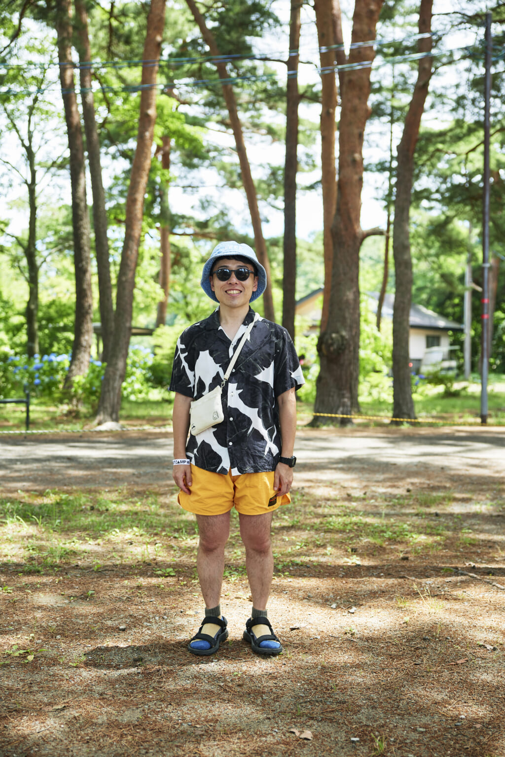 モノトーンの大胆なプリントシャツに合わせたのは、ネイタルデザインやテバといった、ゴーアウトでもお馴染みのブランドたち。サコッシュの帆布素材がよりナチュラル感を加え、会場の雰囲気にもマッチ。
