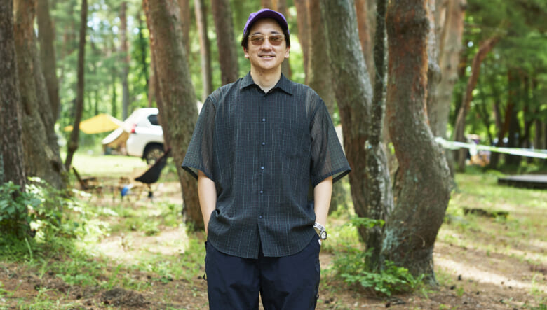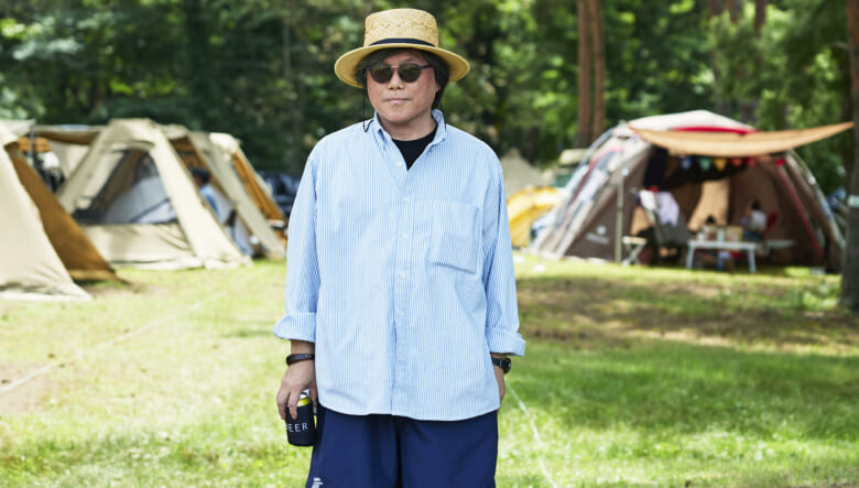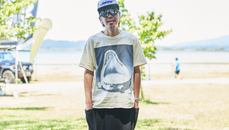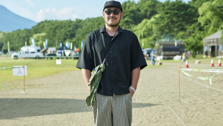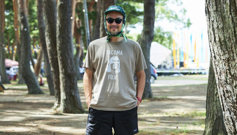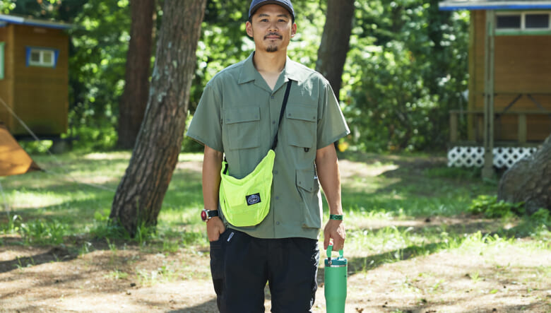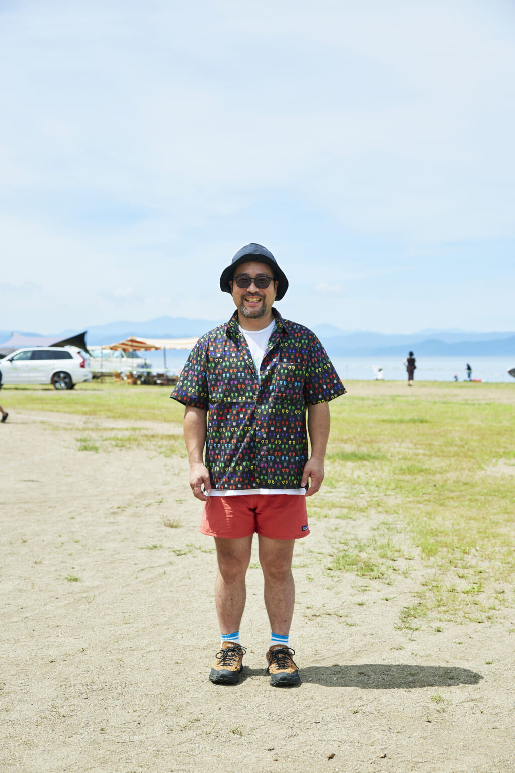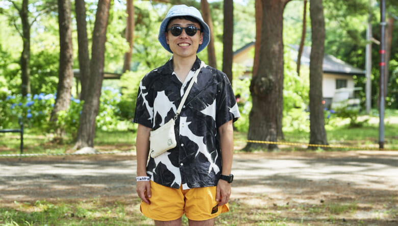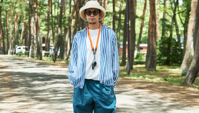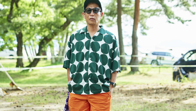キャンプ場や砂浜で動き回れるよう、キーンのジャスパーやヤマボウシで機動性を確保。対照的に明るいオレンジのショーツやハッピーペイントのシャツなど、色や柄で夏らしい軽やかさを取り入れている。
