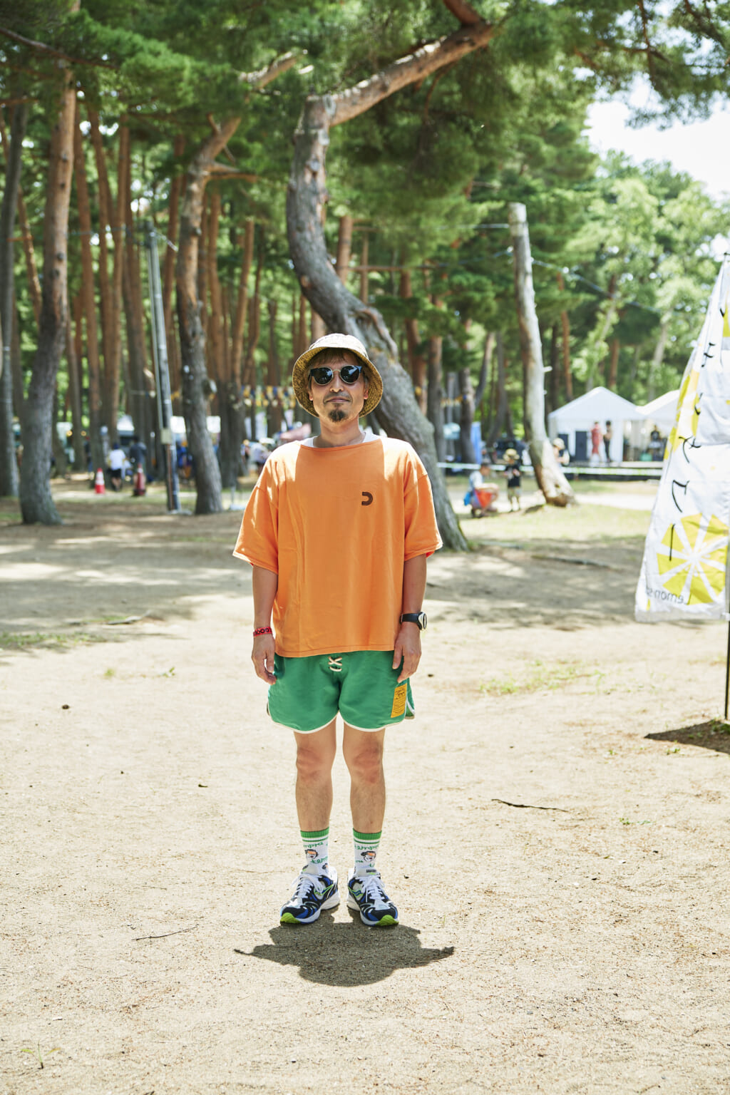 下半身をグリーン系の色で統一し、広いキャンプ場でも一目瞭然の派手な色使いを上手にまとめ上げたコーデ。ボートネックのTシャツや、シュー