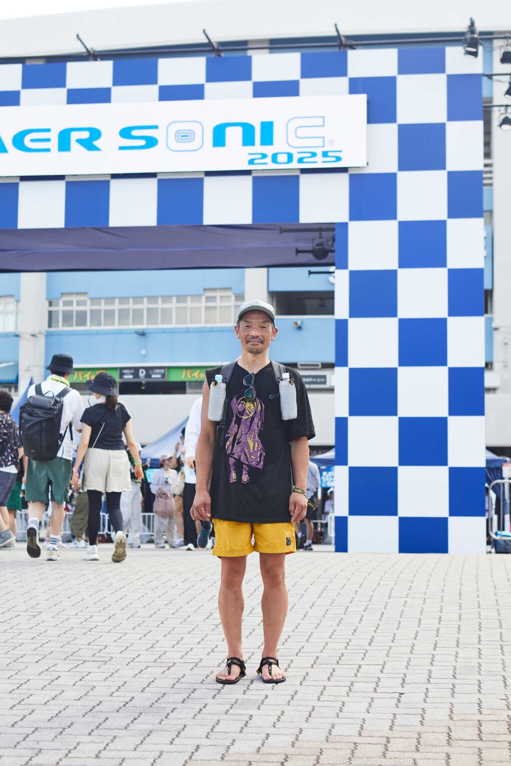 山と道のショーツやカンパイギアワークスのULバッグなど、本格派トレランアイテムで軽快な装いに。履きなれたルナサンダルは会場の移動やライブも快適。当日購入したプロディジーのTシャツで気分も上昇。
