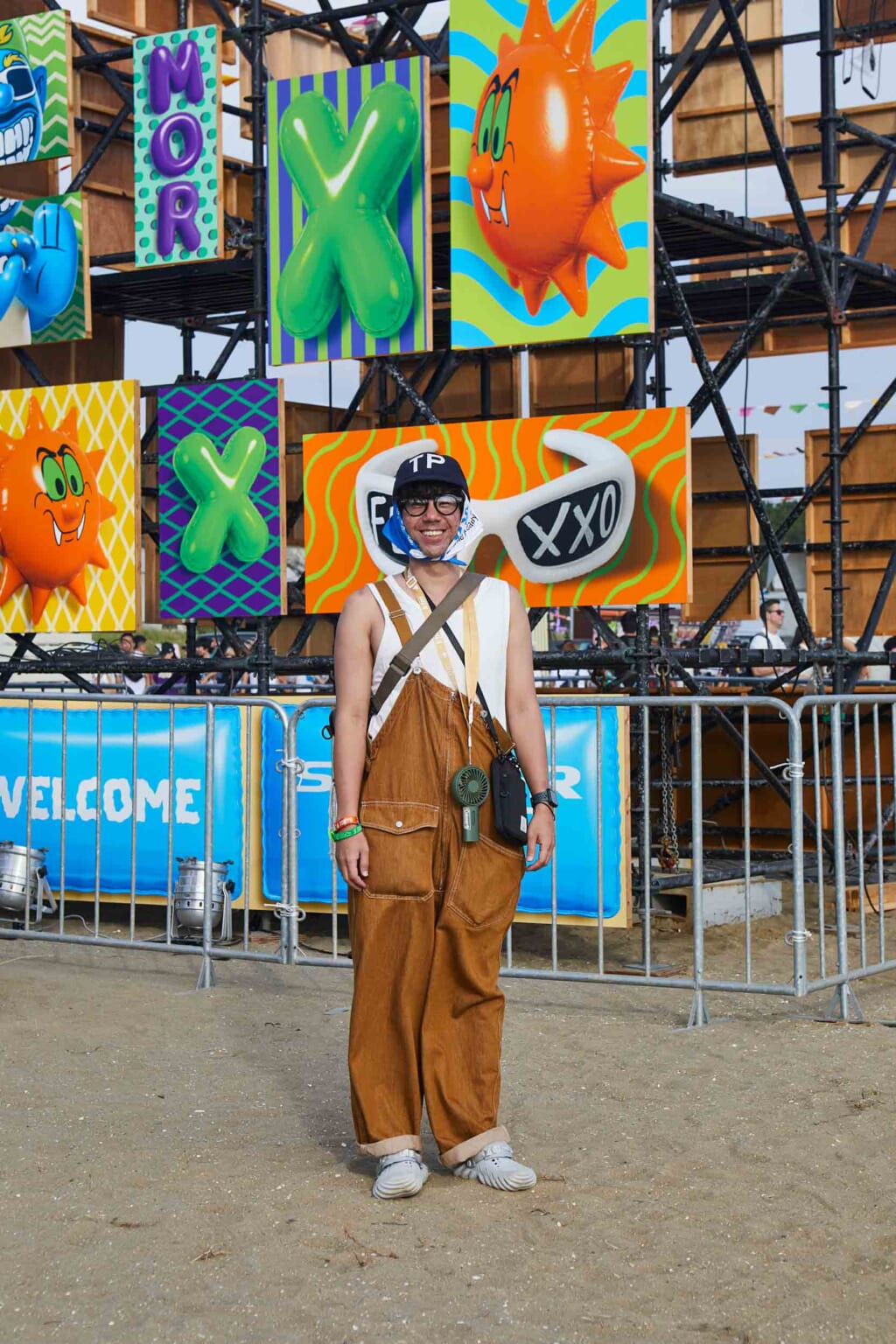ビッグシルエットのオーバーオールは、あると便利なフラップ付きポケットを装備。夏休みを満喫している少年のようなコーディネートながら、ソフトクーラーのバッグやハンディファンで暑さ対策も万全。