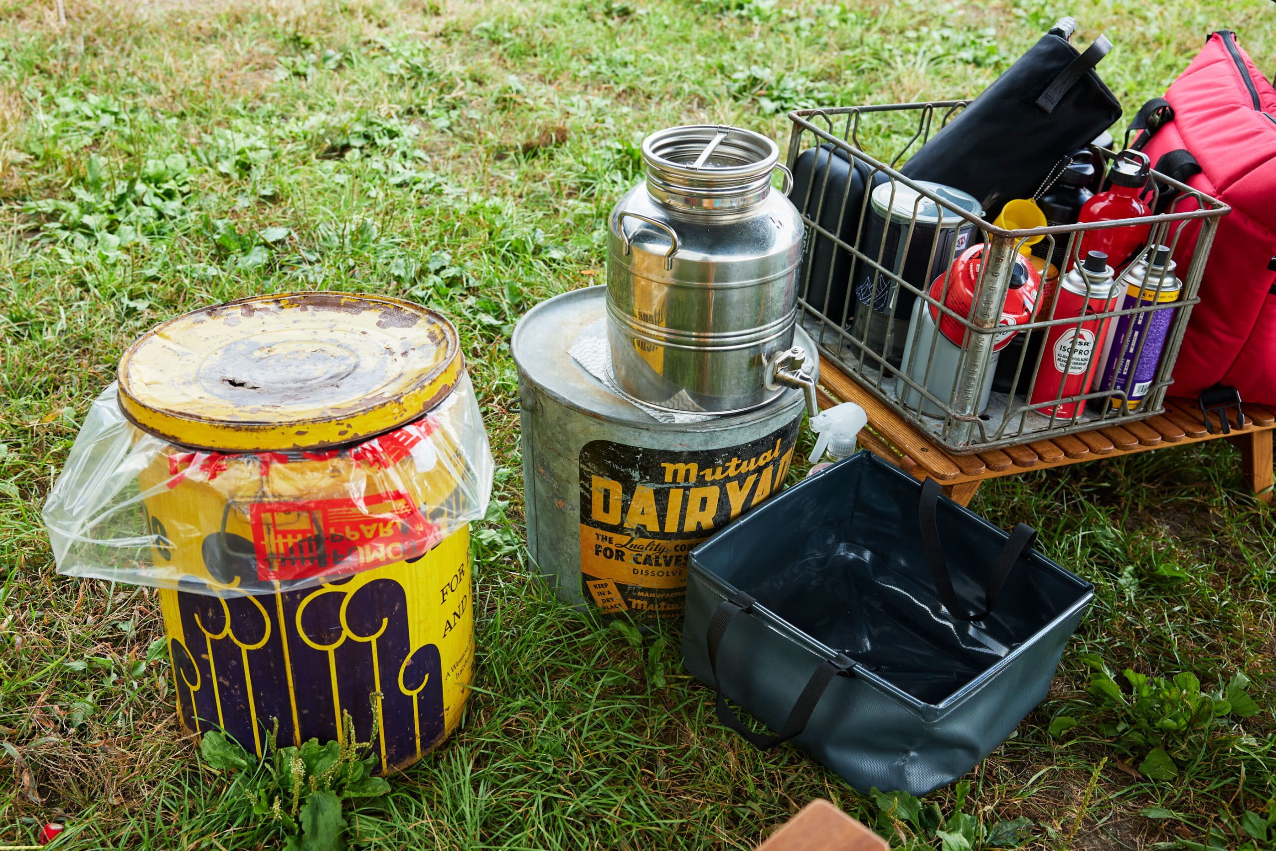 ジャグ台やゴミ箱として使っているのは、ヴィンテージの缶。行き帰りは収納としても。