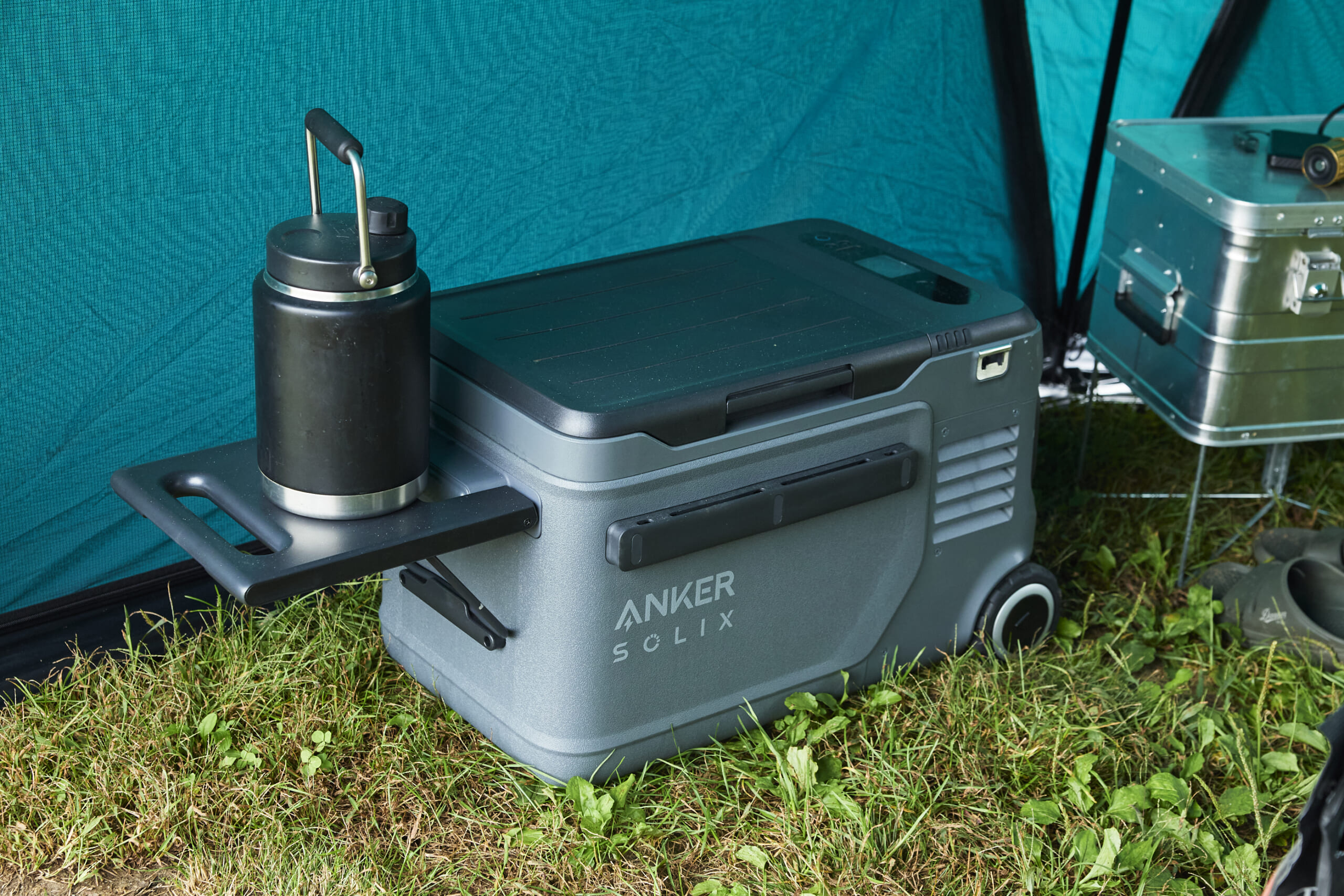 冷蔵・冷凍もできるポータブル冷蔵庫。キャスターやテーブルにもなるハンドルのほか、スマホ充電もできるバッテリーなど便利すぎる機能が満載。テント外のソーラーパネルで充電も可能。
