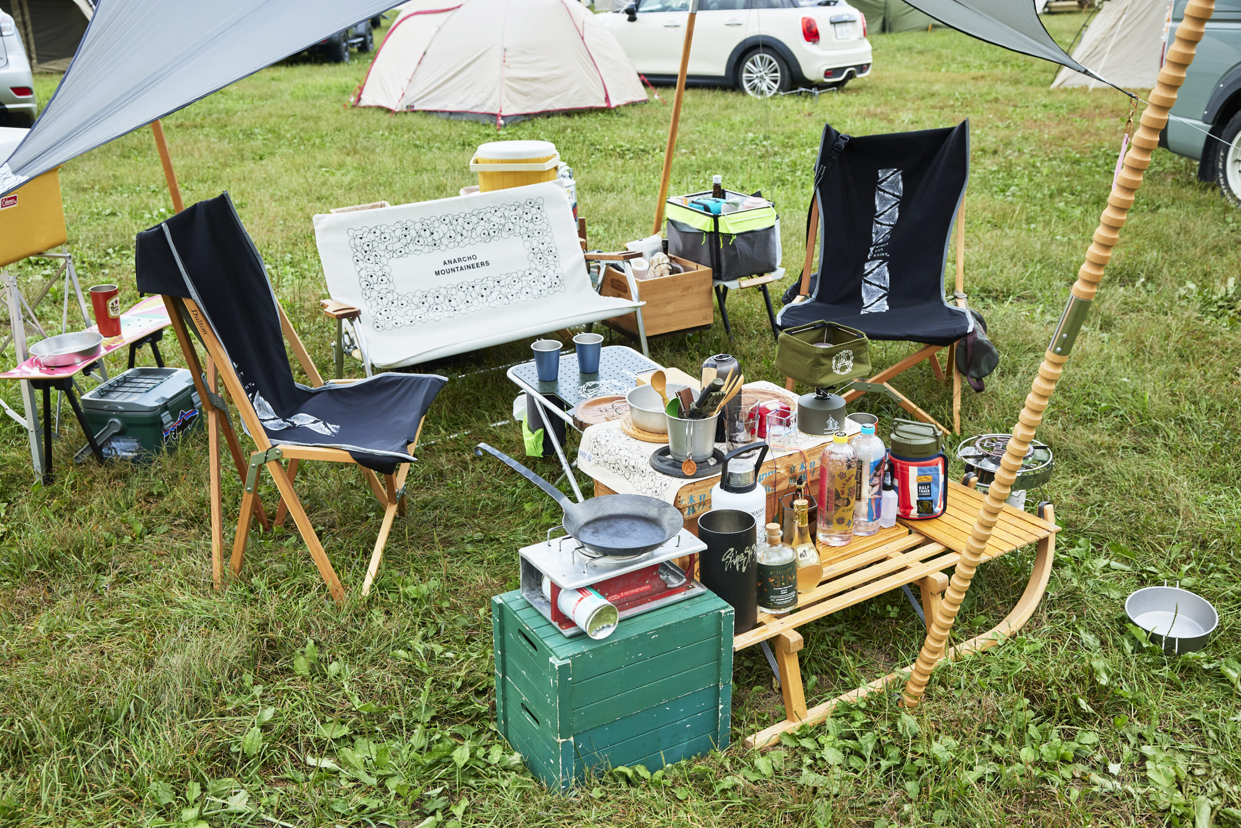 ベンチの座面もアナルコマウンテニアーズのコットン製カバーを掛け、チェアだけでも素材にまとまりが生み出された。