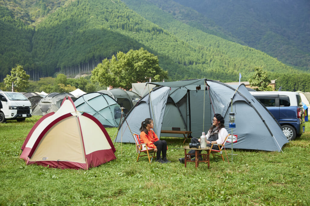 プリムスやモスといった、アメリカを代表するアウトドアブランドのテントが並ぶBEKEさんのサイトは、古きよき時代のキャンパー的な雰囲気が漂う。しかしプリムスのテントに入ると一変して、快適な室内が登場。インナーを外しシェルターとして使ったテント内は親子2人なら十分すぎる広さで、ウッドを基調とした家具が並ぶ。ストーブも完備し、夜はここで父と娘の水入らずの時間を過ごすのだろう。